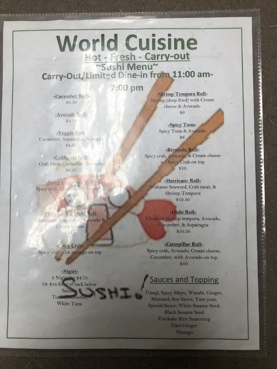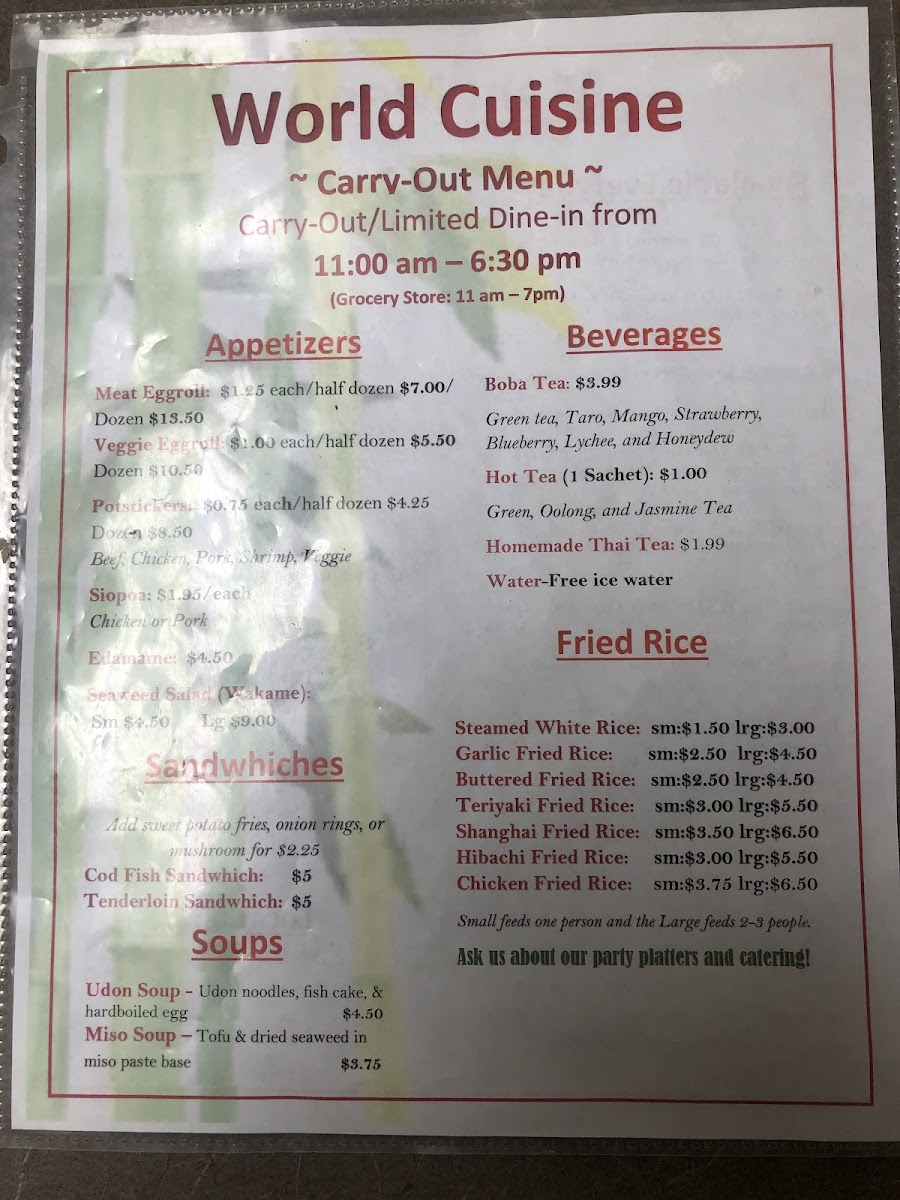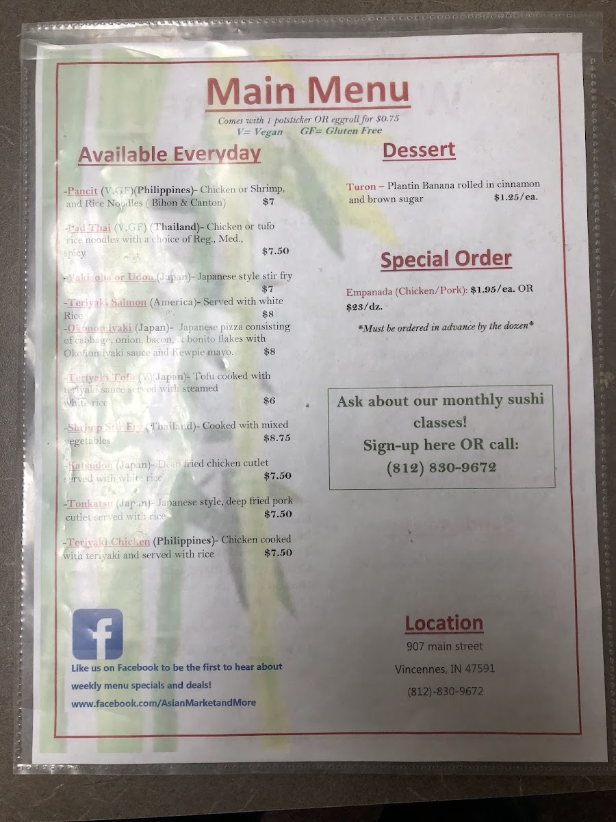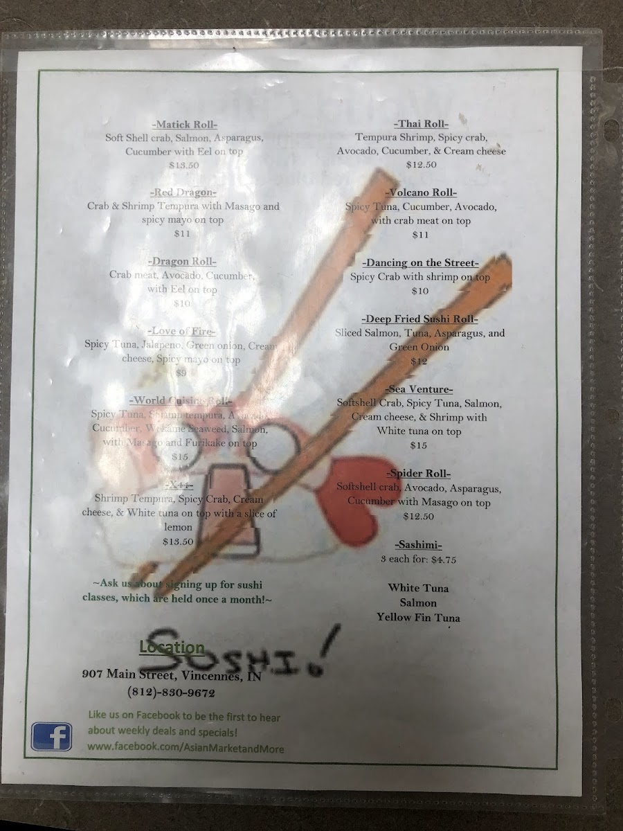 Nestled in the heart of Vincennes at 907 Main St, our charming restaurant invites you on a culinary journey across Asia and beyond. Our menu is crafted to delight your senses and expand your palate with a fusion of flavors and textures from around the world. Expect to be wowed by our must-try specialties like the tantalizing Caterpillar Roll, the exquisite Oishi Roll, and the irresistible Hurricane Roll. Each dish is meticulously prepared to offer a symphony of flavors that both comfort and excite. Don't miss out on our Spicy Tuna and Shrimp Tempura Roll for a delightful kick! Whether you're in the mood for something classic like the California Roll or a veggie option to satisfy your plant-based cravings, every item promises a memorable dining experience. Join us at Asian Market/World Cuisine and let your taste buds embark on this delicious adventure today!